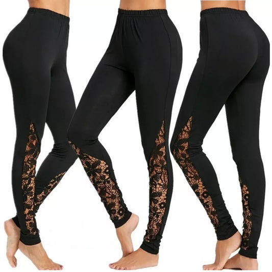 Ladie's High Waist Black Lace Leggings Floral Lace Side Panel Cut Out S-2XL